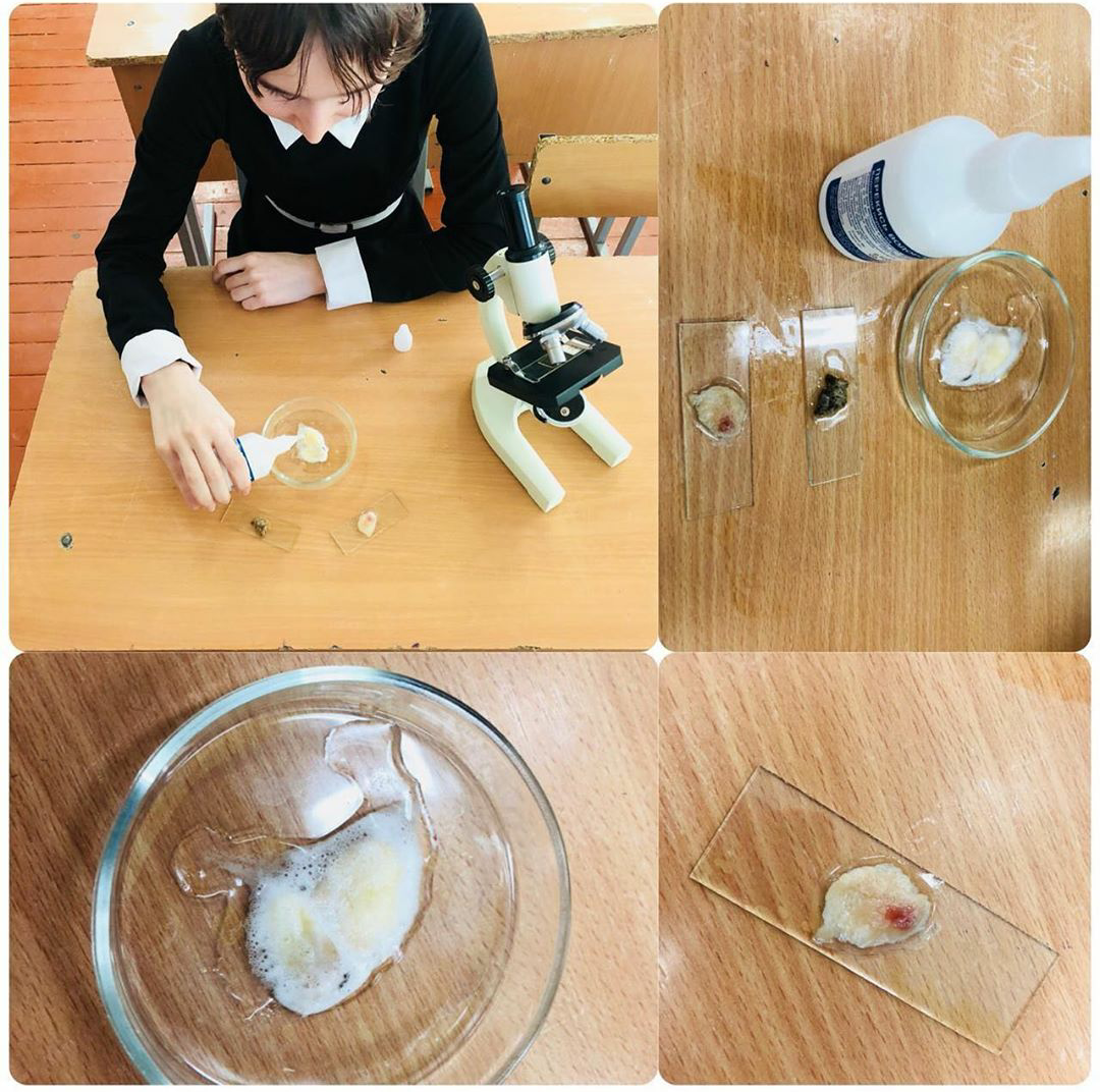 Урок биологии в 10 "Б" классе. Учащиеся определяют наличие белка каталазы в пищевых продуктах