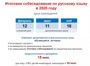 Согласно Порядку проведения государственной итоговой аттестации по образовательным программам основного общего образования 11.03.2020г. состоится итоговое собеседование в 9-ых классах.