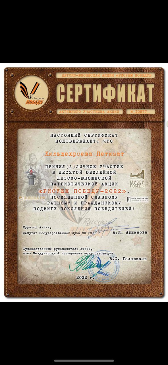 Ученица 6 Б класса Хильдехроева Петимат приняла участие в десятой юбилейной детско-юношеской патриотической акции "Рисуем Победу - 2022" посвященной славному ратному и гражданскому подвигу поколения победителей!